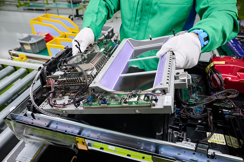 - Attach front mask, reel, and other parts to the cabinet. Then it is taken to the inspection line.