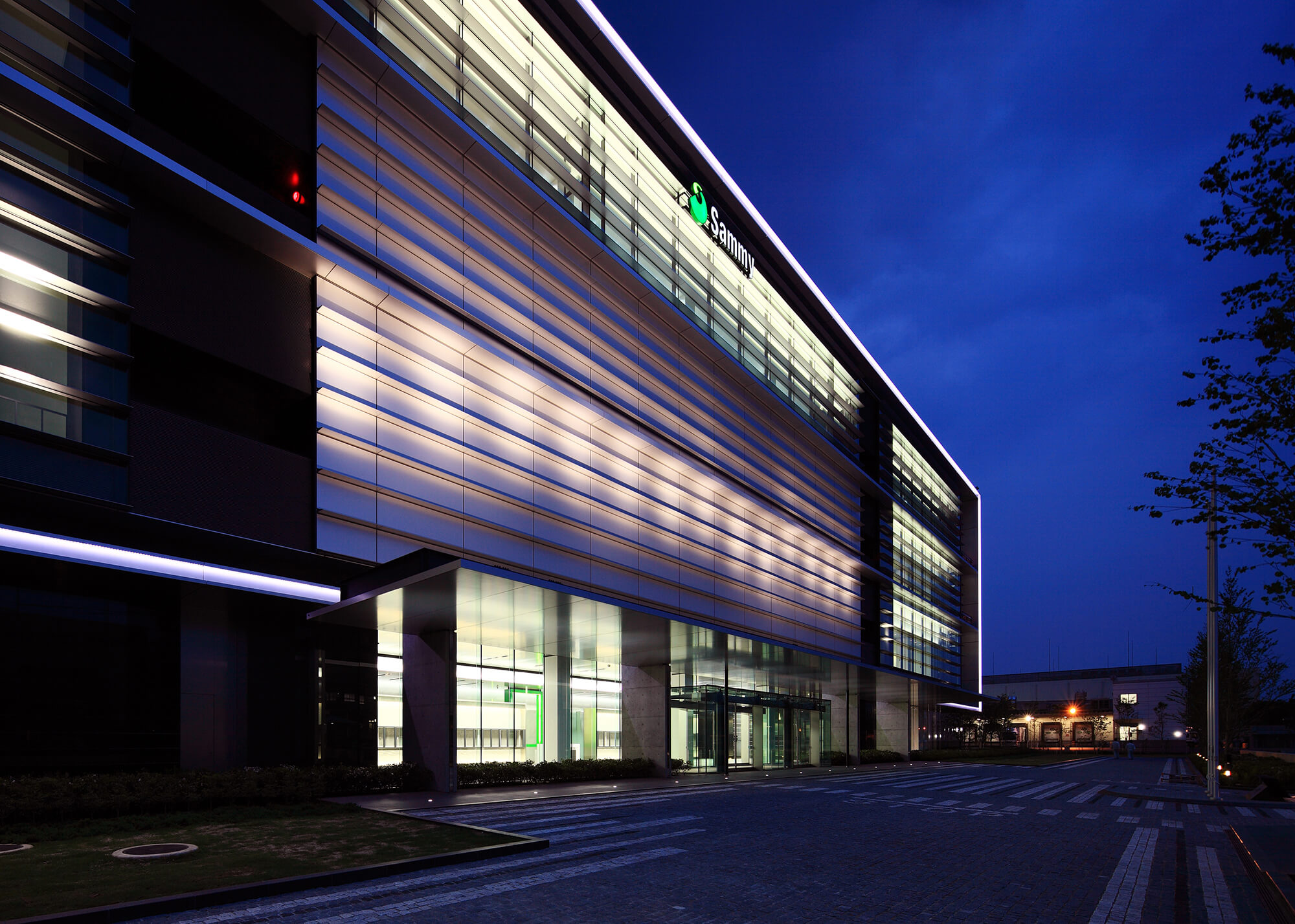 From sunset to 10:00 p.m., the exterior of the building is lit so that people walking in front of the building can pass by safely. The Kawagoe Factory site is also environmentally friendly, with lawns, trees, and other green areas.
