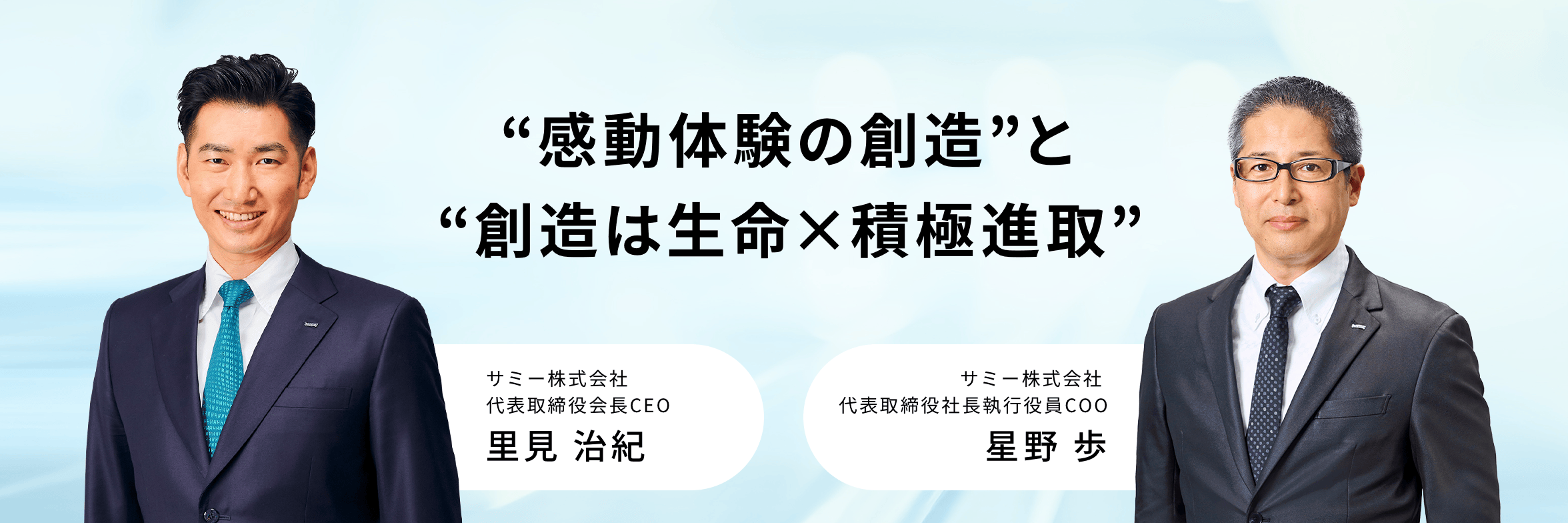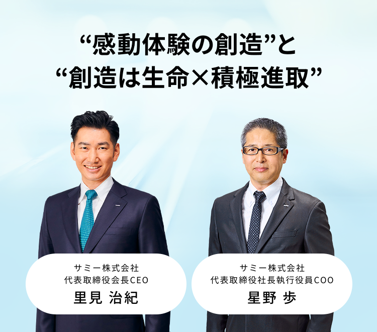 サミーはこれまでも、「新しいものはサミーから」という開発方針のもと、業界をリードする斬新な遊技機を世に送り出してまいりました。その原動力となってきたのは、当社不変の遺伝子として創業時から社是として掲げる“積極進取”の精神でございます。この“積極進取”とともに、数多くの革新と感動を創造してきたセガの価値観である“創造は生命(いのち)”を合わせた“創造は生命×積極進取”を新たなバリュー(価値観・DNA)として、社員一人ひとりが心に刻み、これからも皆さまにより多くの感動をお届けしてまいります。そして“業界の革新者”として、自由な発想と旺盛な好奇心を持ち、これまでの既成概念に捉われることなく、チャレンジし続けてまいります。