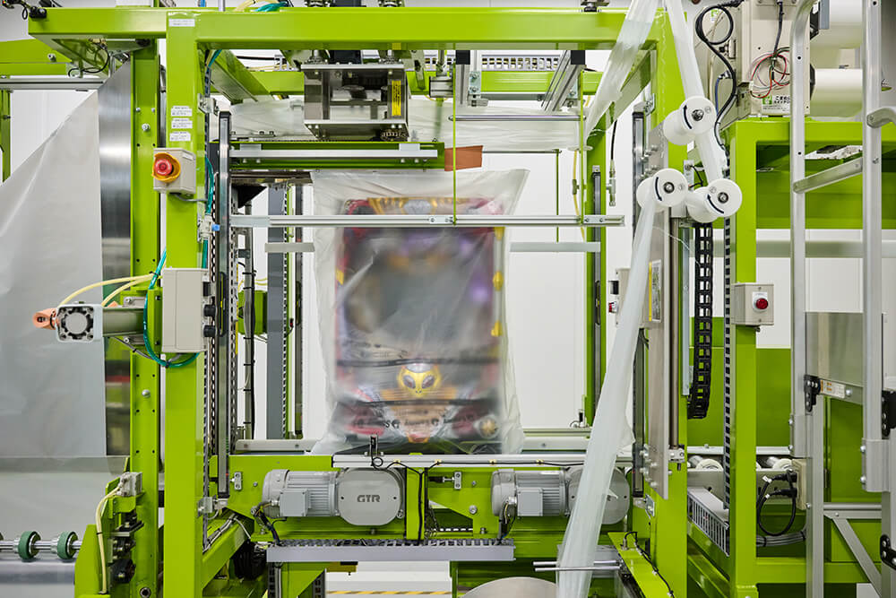 - 完成したパチンコ機は自動梱包され、出荷されます