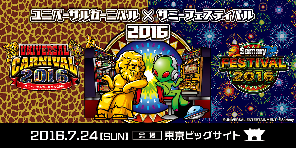 サミー株式会社(本社:東京都豊島区 代表取締役社長 COO:里見 治紀 )は、この度、株式会社ユニバーサルエンターテインメント(本社:東京都江東区 代表取締役社長:富士本 淳 以下、ユニバーサルエンターテインメント)が開催する史上最大級ファンイベント「ユニバーサルカーニバル2016」へ「サミーフェスティバル2016」として参戦し、平成28年7月24日(日)東京ビッグサイトにて過去最大級の「パチンコ★パチスロファンイベント」を共同開催いたします。