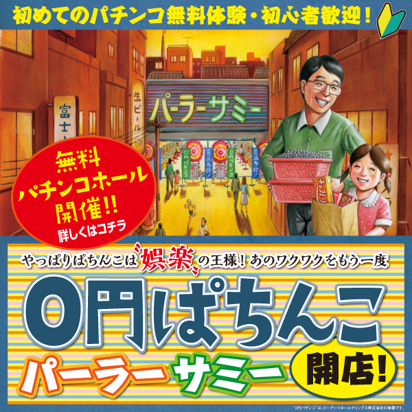 これまでの特定機種のファンイベントとは一線を画し、「0円ぱちんこ」と銘打ち各会場を疑似ホール化! 今までパチンコに触れた事のない未経験の方や、長い間パチンコを離れていたみなさまを対象に"大衆娯楽"として広まったパチンコを心ゆくまで楽しんでいただくイベントです。