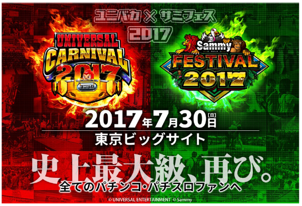 サミー株式会社(本社:東京都豊島区 代表取締役社長 CEO:里見 治紀 )は、この度、ユニバーサルエンターテインメント株式会社(本社:東京都江東区 代表取締役社長:富士本淳)と「サミーフェスティバル2017」「ユニバーサルカーニバル2017」を共同開催する運びとなりましたので、お知らせいたします。