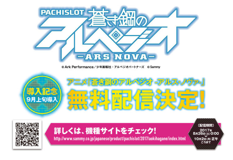 サミー株式会社(本社:東京都豊島区 代表取締役社長 CEO:里見 治紀 )は、この度、『パチスロ蒼き鋼のアルペジオ -アルス・ノヴァ-』の導入を記念して、アニメ蒼き鋼のアルペジオ -アルス・ノヴァ-(全12話)無料配信いたします。