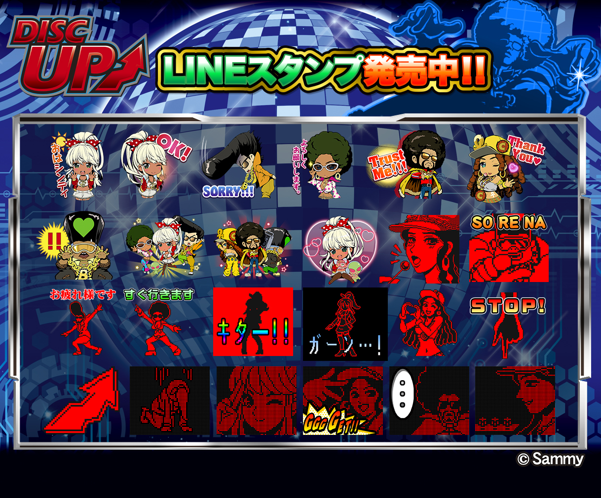 サミー株式会社(本社:東京都品川区 代表取締役社長 CEO:里見 治紀)は、LINE株式会社が運営するコミュニケーションアプリ「LINE」のスタンプショップにて、「ディスクアップ」のキャラクターを使用した『ディスクアッパーに捧げるスタンプ』の販売を開始します。
