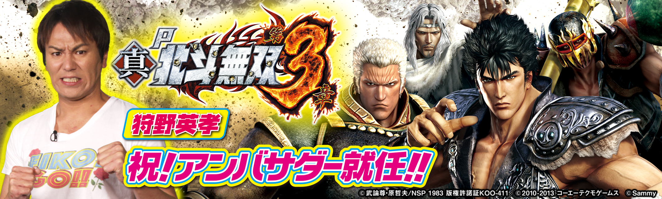 サミー株式会社(本社:東京都品川区 代表取締役社長 CEO:里見 治紀)は、新機種「P真・北斗無双 第3章」において人気タレント「狩野英孝」さんがアンバサダーに就任しましたことをお知らせいたします。